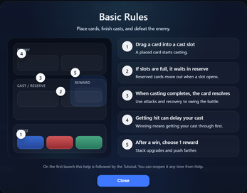 Cards do not activate instantly. You drag them into cast lanes, wait for the cast to finish, and try to keep your tempo while the enemy attacks and delays you.